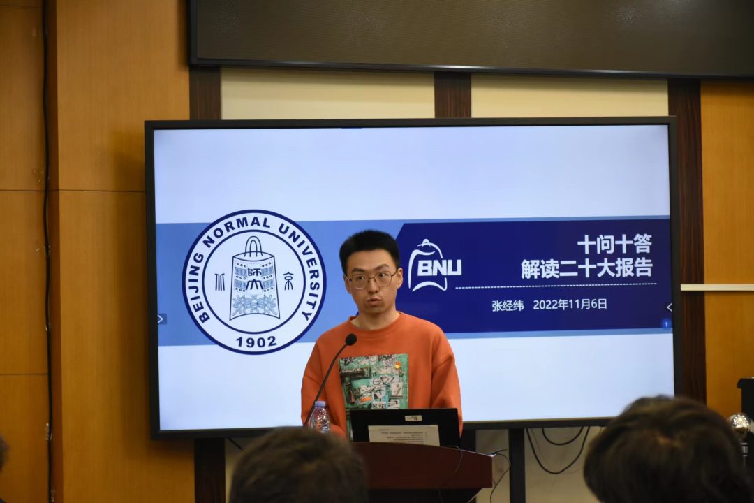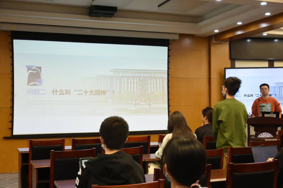 会议伊始,马克思主义学院的张经纬同学在调查了同学们对政治的了解程度后,用十个问题,系统地讲述了二十大精神。