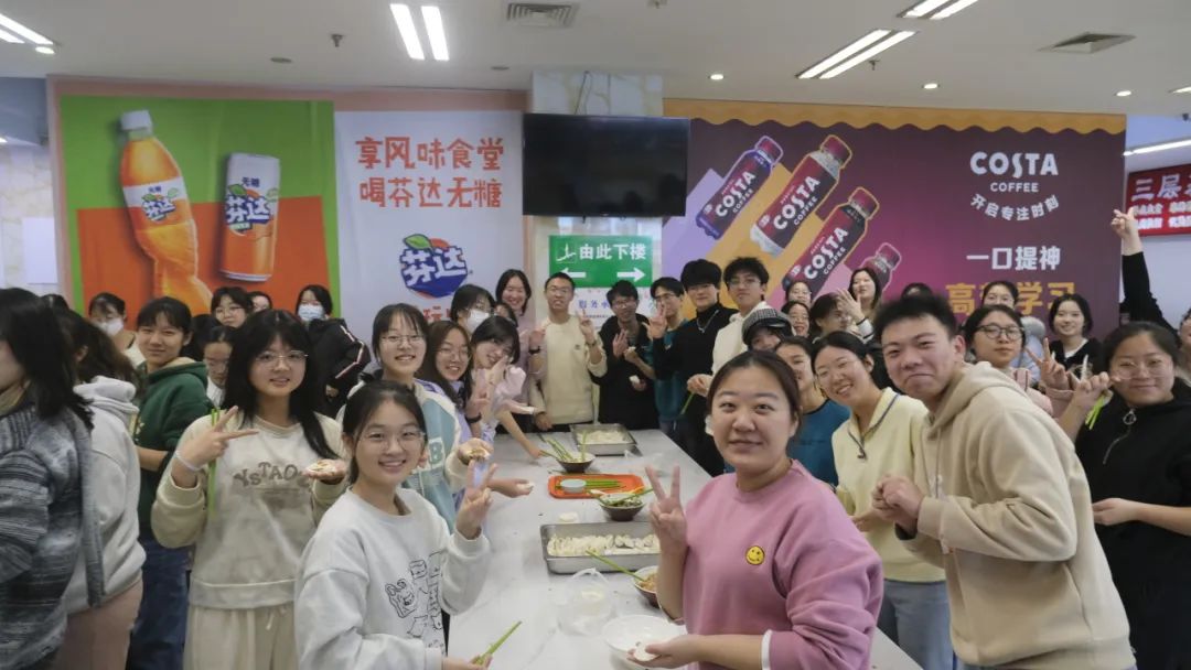 为弘扬传统文化、促进师生交流,化学学院2024级本科2班、2024级药班、2023级本科1班、2023级本科2班于2024年12月21日在新乐群食堂三楼共同举办“用心‘饺’流,情满冬至”饺子节活动。活动邀请到化学学院党委副书记马琼老师、2024级本科药班班主任曹玮老师、2023级本科2班班主任刘广建老师参与。60余名化学学院师生齐聚一堂,在严寒的冬日感受家的温暖,传递同窗温情。
