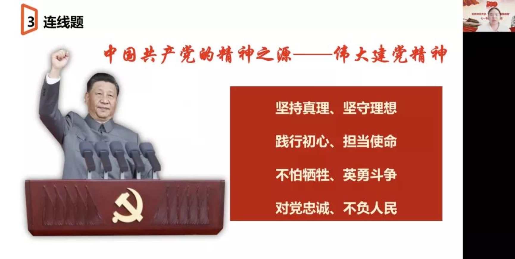 接着,严奕骁又带领同学们完成了“庆祝中国共产党成立100周年大会应知应会”测试卷,通过这种新颖的方式引起同学们的思考,进而展开详实而精彩的讲解,将祖国的强大和青年人的担当再次展现在同学们眼前。
