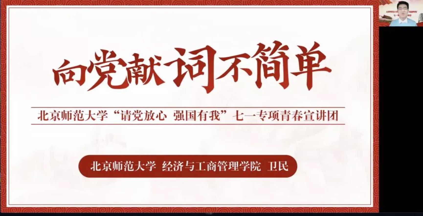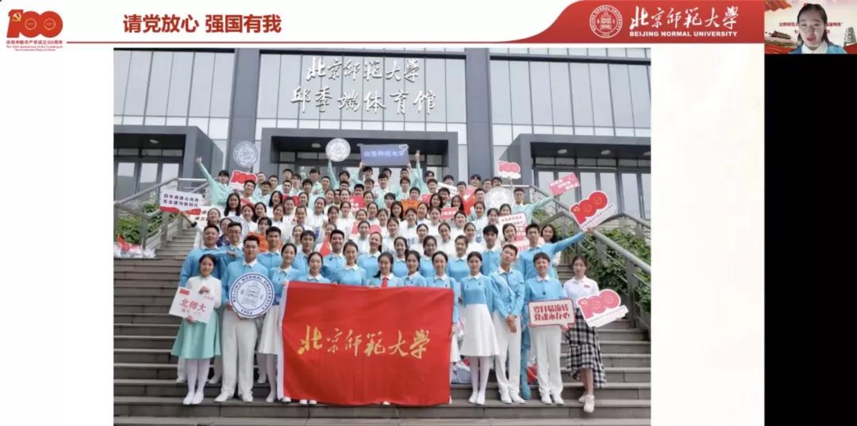 在这场意义非凡的庆祝活动中,不乏师大人的身影。四位宣讲人结合建党一百周年习总书记“七一”重要讲话精神相关内容,向我们讲述了北师大人服务保障建党百年庆祝活动的点滴记忆和励志故事。让我们随他们一起,走进幕后筹备的九十多个日子,重温那段紧张而又充实的时光吧!