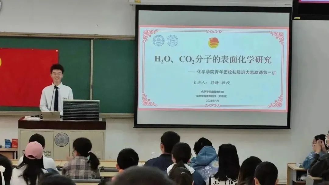 2023年4月15日上午10:00,化学学院初级团校“化学+教育”大思政课第三讲在生命科学学院第四教室顺利进行。北京师范大学化学学院郭静教授受邀出席,为同学们带来以“水分子、二氧化碳分子的表面化学研究”为题的讲座。