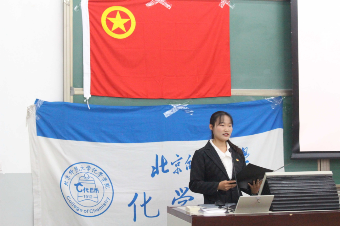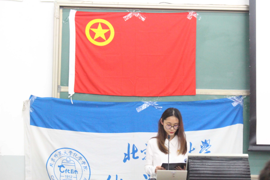 接着化学学院学生会主席杨若琳同学宣读了《北京师范大学化学学院第十八次团员、学生、研究生代表大会致全院广大同学的倡议书》。