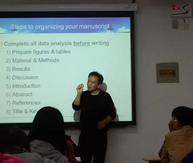 晚上八点,教四110已是座无虚席,在同学们热烈的掌声中,汪教授开始了他科技论文写作的讲解。教授先简述了科技论文的概念和结构,然后针对同学们在写论文时遇到的困难和容易犯的错误,对科技论文的各个结构做了详细的说明,包括在题目、摘要、正文、参考文献等各方面的注意事项。除了讲理论知识,汪教授还做了一些演示,让同学们更好理解。
