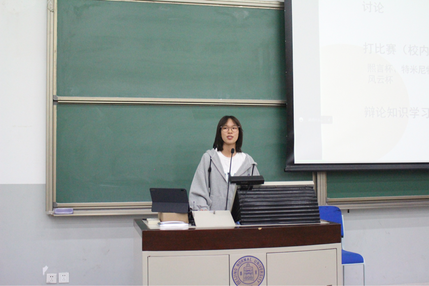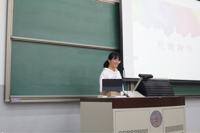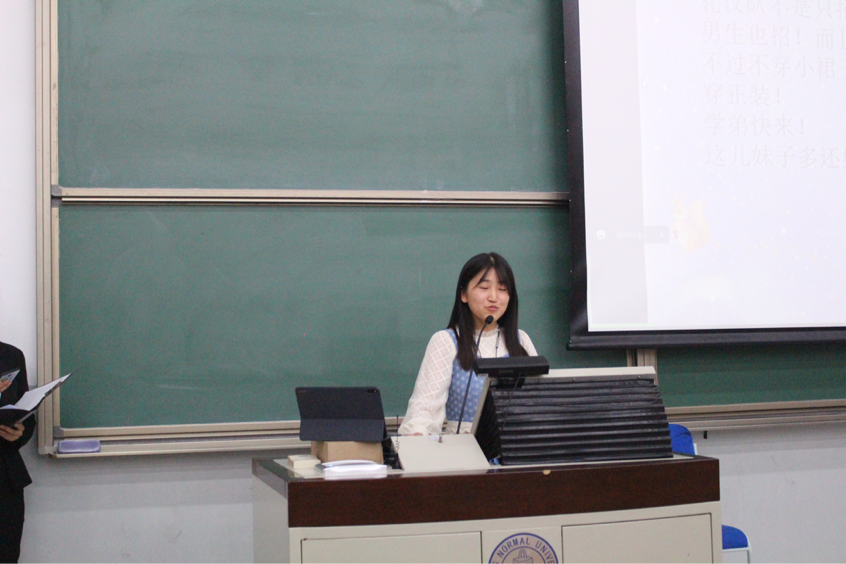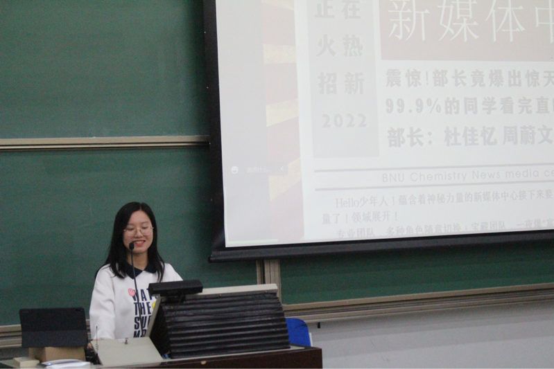 接下来,北京师范大学化学学院学生会主席杨若琳向同学们分享了自己在学生会的成长经历并介绍学生会相关工作和特点,邀请同学们加入学生会。